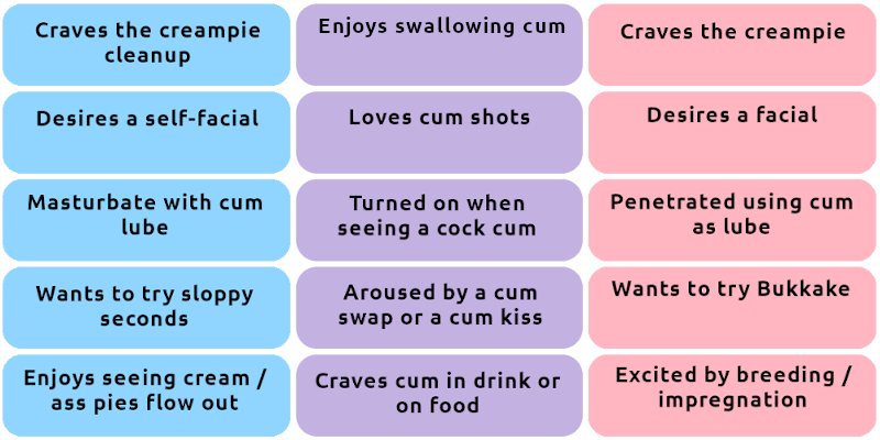 Why are you here? You have a cum kink. In simple terms, a cum kink is when someone is sexually aroused by the sight, smell, taste and feel of semen and they desire to have it on or in their body or both. Cum kinks can take on many forms. Below is a list of the most common cum-filled activities.